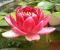 kräftiges glänzendes dunkelrot, zur Mitte etwas satter werdend, schalenförmig, Blüten erheben sich 2-5 cm über das Wasser, 8 cm Ø, 26-32 löffelförmige Blütenblätter